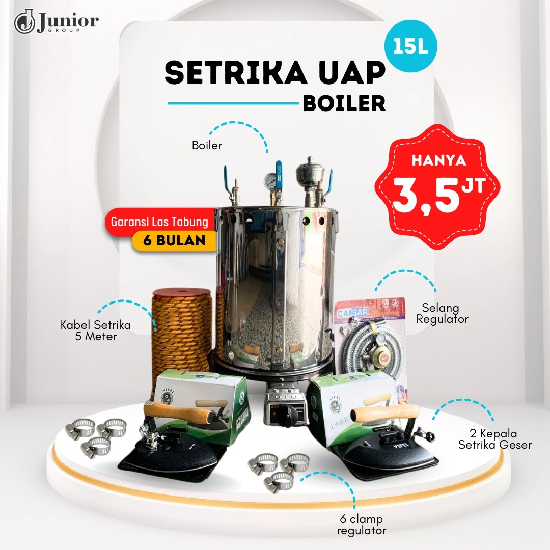 Boiler setrika 15 liter sangat cocok digunakan oleh usaha laundry kiloan, hotel, hingga industri garmen dan konveksi. Dibuat dengan material berkualitas tinggi, setrika uap ini dirancang agar tahan lama, aman digunakan, dan mampu meningkatkan produktivitas usaha Anda.
